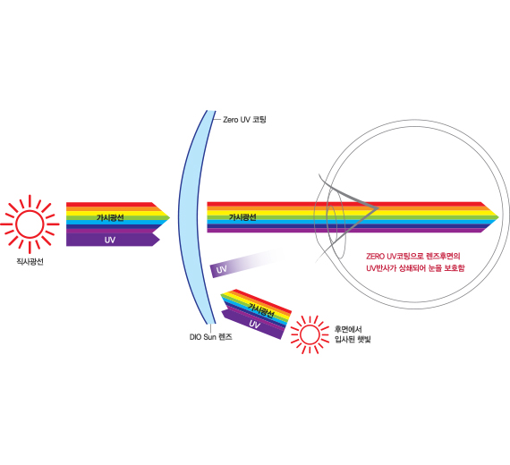 정면 입사광만을 고려한 종래의 모든 코팅 렌즈들과 달리 Zero UV 코팅은 측면에서 입사되어 렌즈 후면에서 반사되는 가시광선 뿐만 아니라 자외선까지 방지함으로써 시감을 향상시키고 눈을 최대한 보호하는 첨단 코팅 기술입니다.